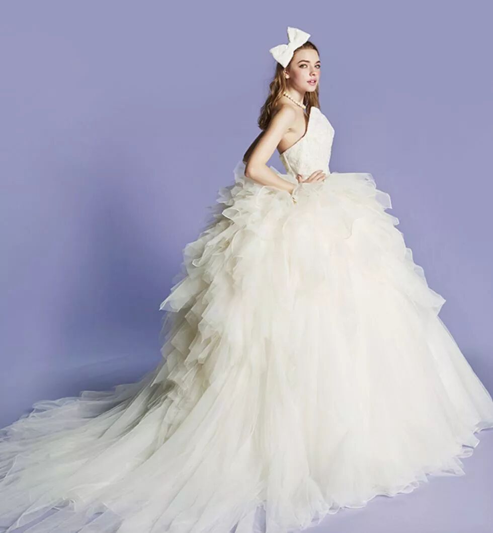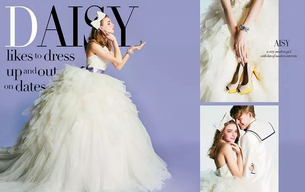这一系列采用纺纱蛋糕裙的样式,一层层犹如瀑布直流平地,很cute但不会显得幼稚,婚纱一万八起,